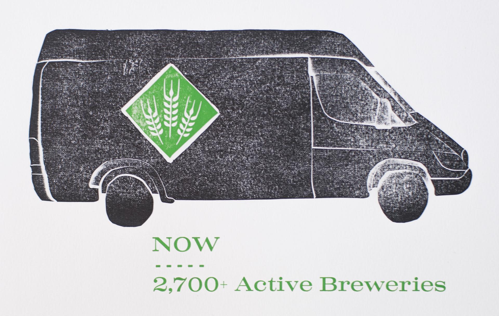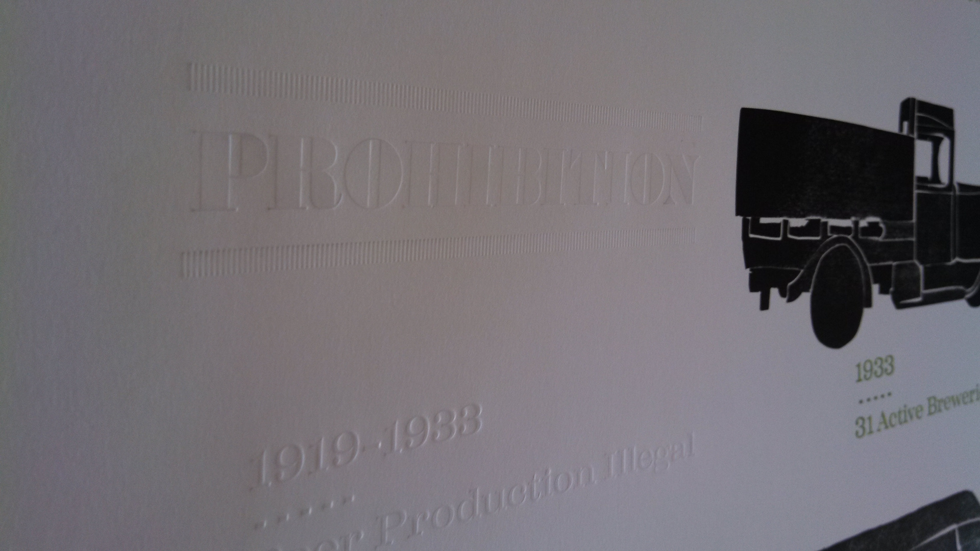 Every year, Summit Brewing Co. celebrates the repeal of prohibition with an new, annual poster design and by throwing a Repeal Day event at their Saint Paul brewery/taproom. We combined a variety of techniques to produce a poster with early 20th century charm and a contemporary composition. The piece is a distilled timeline of the number of active breweries in the United States at different stages in recorded history. The vehicles were chunks of hardwood cut into puzzles. The pieces you see were left “type high” while the remainder of the block was either cut down or engraved away. The type was printed using lead versions of the typeface Craw Modern, except “Prohibition” which is set in Bodoni Ultra. Summit's 2 versions of their logo were produced using photo-polymer plates.