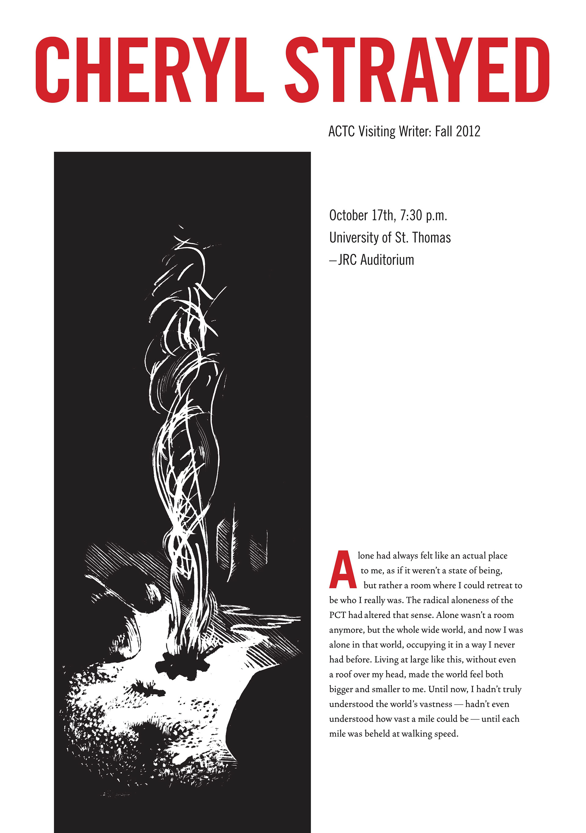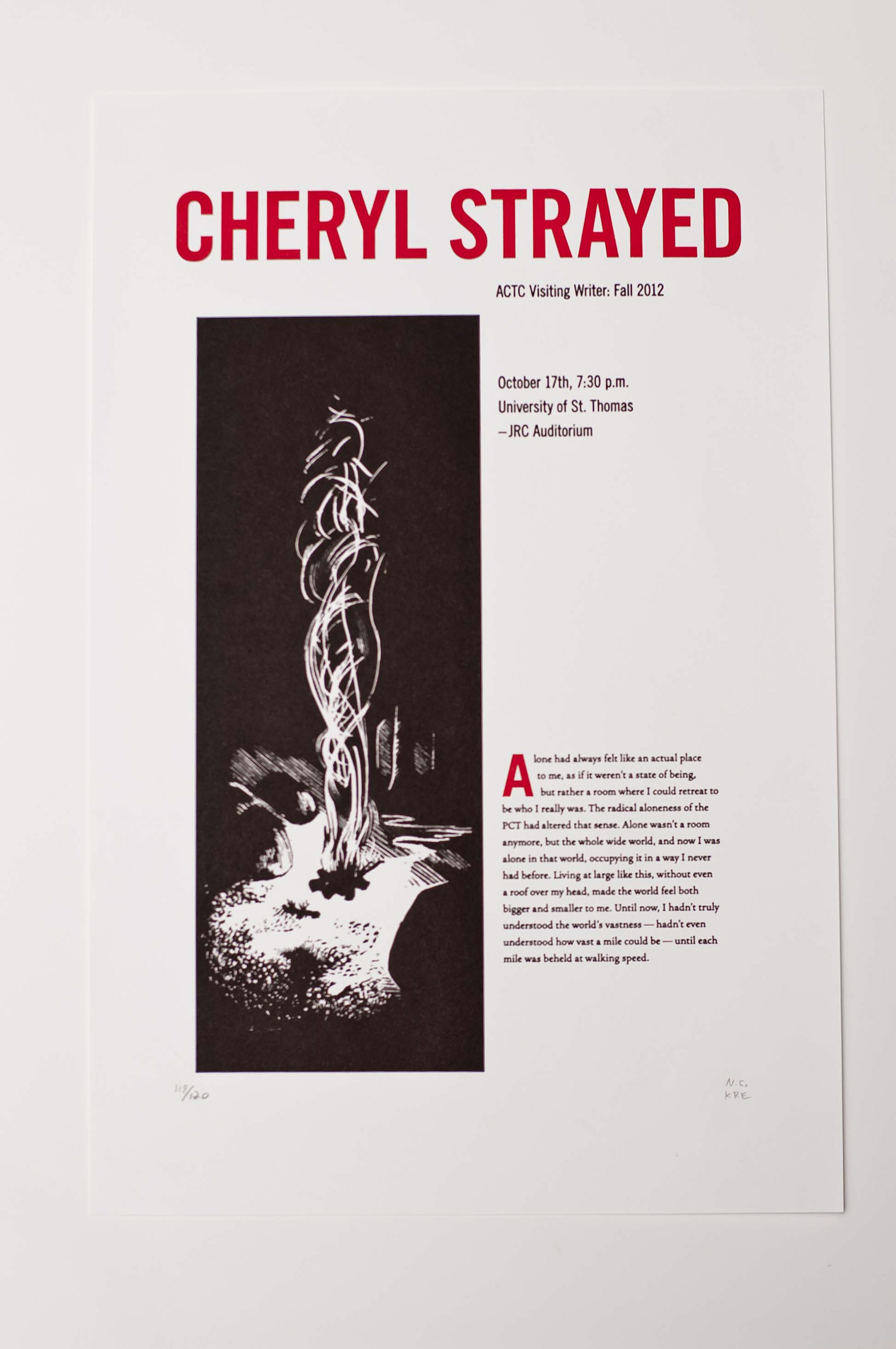Nate Christopherson and I produced a broadside for an Associated Colleges of the Twin Cities visiting author event which featured Cheryl Strayed, author of Wild. The broadsides are 11x17 and printed with 2 colors on letterpress.