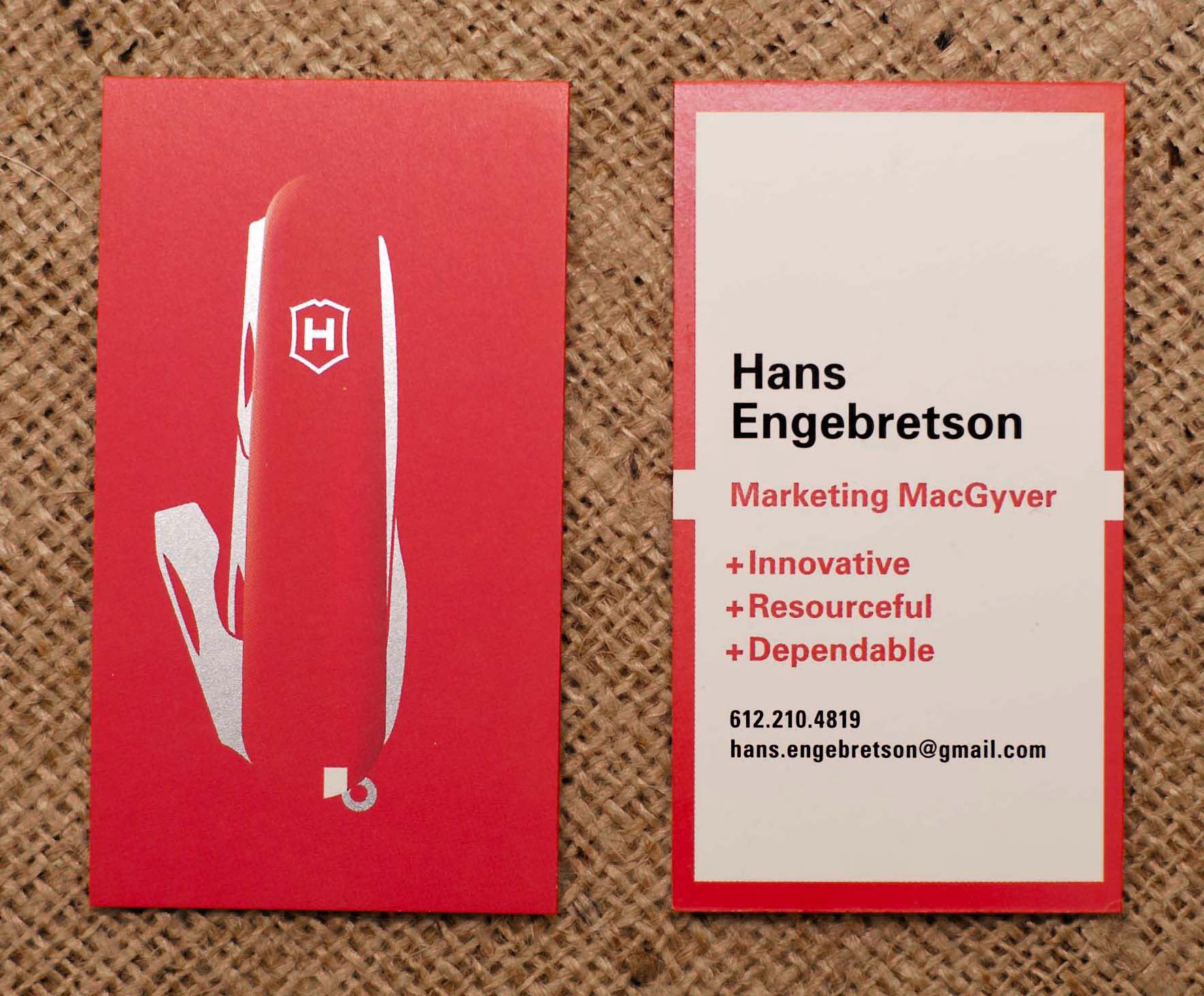 Innovative, resourceful and dependable marketing consultant, Hans Engebretson, tasked me with creating his business cards. The simple and bold design plays of the central tool of MacGyver's ingenuity… the Swiss Army Knife. There is a coat of gloss applied to all exposed areas of the knife's metal on the illustration.