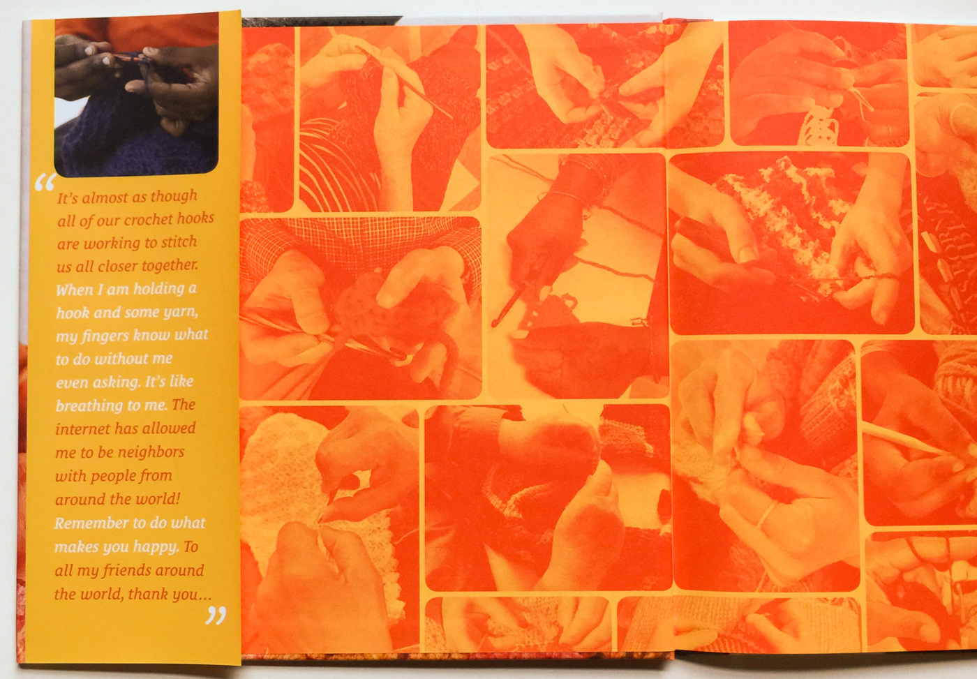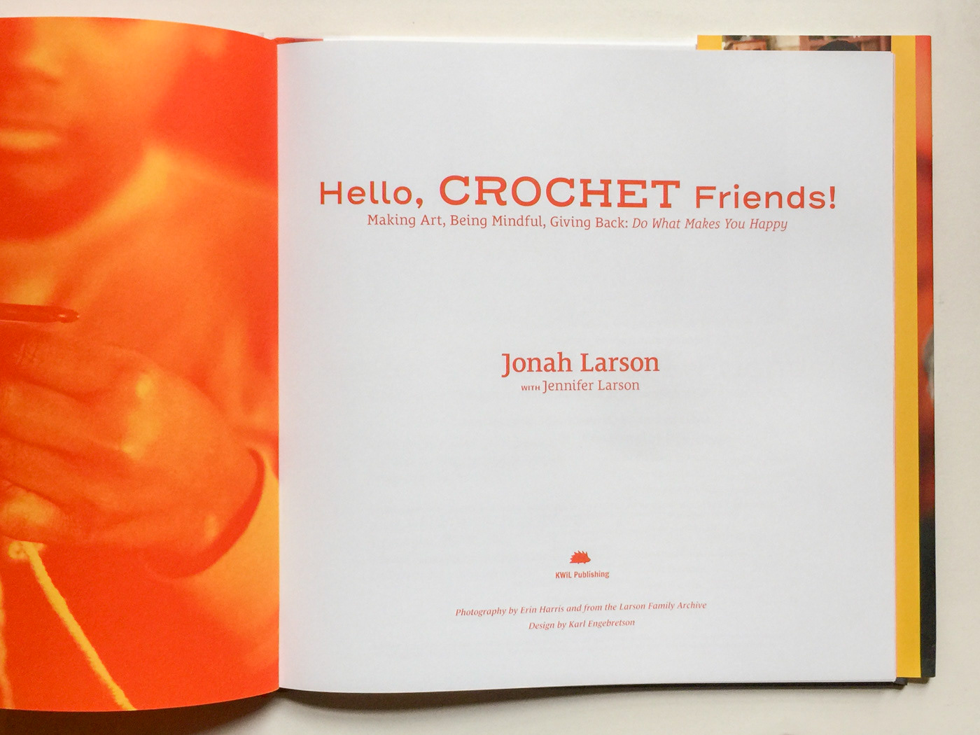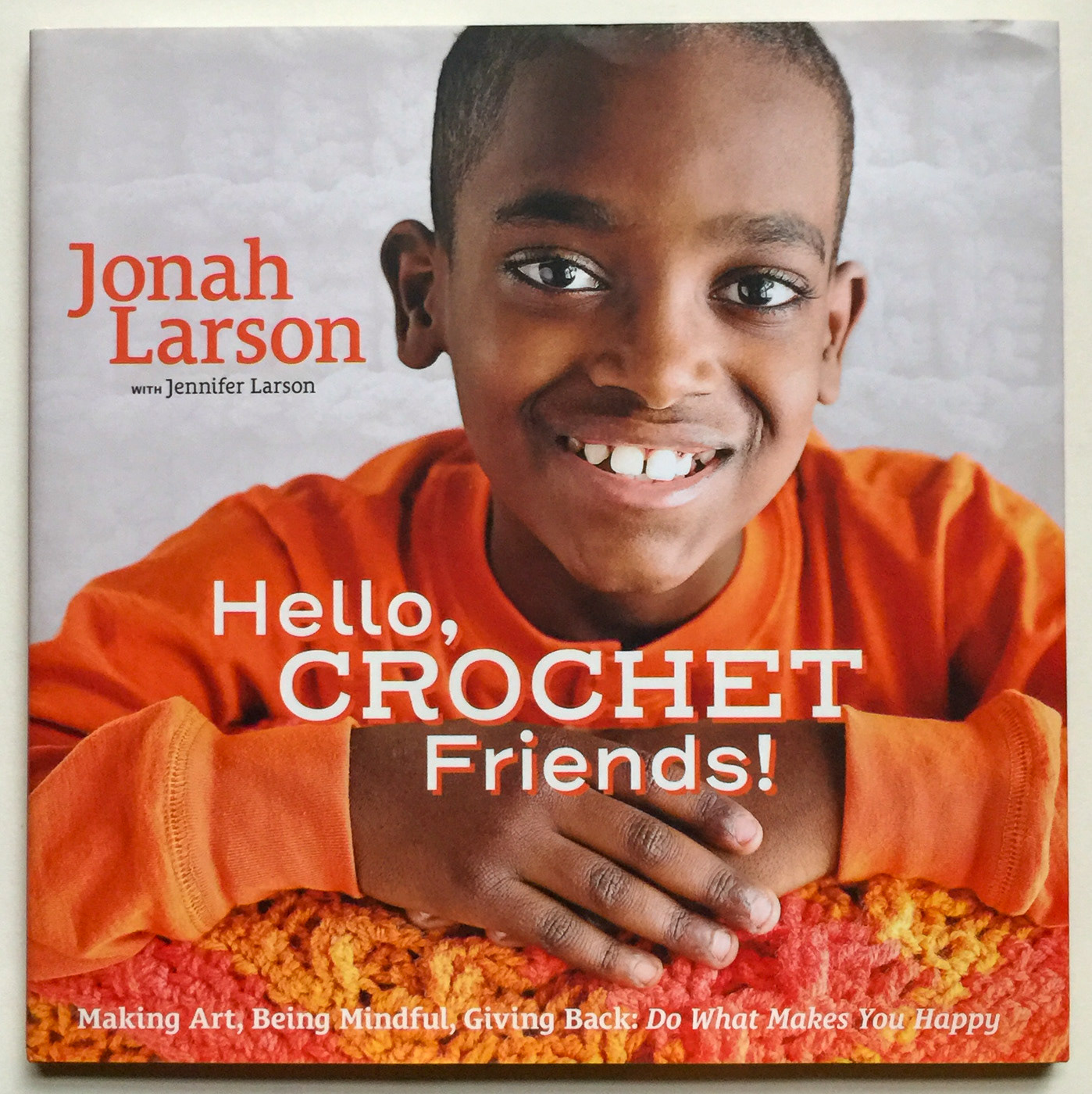 Book design for Hello, Crochet Friends! Making Art, Being Mindful, Giving Back: Do What Makes you Happy by Jonah Larson. Mix of Crochet introduction and life story of young, savant of crochet, Jonah Larson. Design incorporated illustration, custom typography, and special run for the end papers—building a sense of the crochet community.